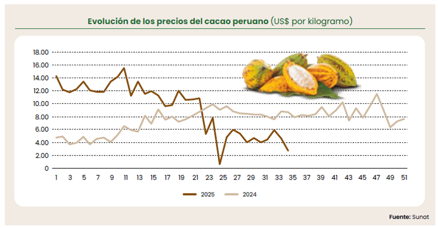 La baja del precio del arándano responde a una gran oferta concentrada en meses de alta intensidad productiva, lo que limita la capacidad del mercado de absorberla sin afectar los precios. Para el cacao, la fuerte corrección está influida por el anuncio de mayores cosechas en los principales exportadores de África Occidental, como Ghana y Costa de Marfil. Además, muchas grandes industrias chocolateras ya habían asegurado su abastecimiento con contratos futuros, reduciendo la presión compradora en el mercado spot. En cuanto al mango fresco, la caída de precios se relaciona con la sobreproducción en Lambayeque, la baja demanda y el aumento de exportaciones desde Brasil y México, que intensificaron la competencia.