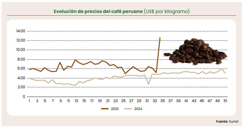 De manera similar, el precio promedio del mango en toda su campaña (semanas 1-22) experimentó una variación negativa de -48%. El café en grano igualmente vio una disminución en su valor FOB de -44% en el primer bimestre, aunque posteriormente sus precios internacionales repuntaron, basados en eventos climáticos y los aranceles de +50% de Estados Unidos a los dos principales productores mundiales, Brasil y Vietnam. Incluso la uva, otro producto estrella, registró una disminución de -17% en sus precios.