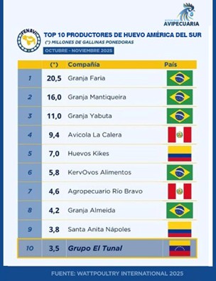 Avícola La Calera se posiciona como 4º mayor productor de huevo en Sudamérica, con alrededor de 6.5 millones de gallinas ponedoras en producción. Por su parte, Agropecuaria Río Bravo ocupa el 7º lugar entre las principales empresas productoras de huevos, consolidando la presencia peruana en el ranking regional.