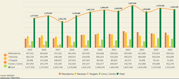 Detalló que la producción de mandarinas ascendió a 595.023 toneladas, registrando un aumento de +3.84% (573.023 toneladas en el 2024); de naranja sumó 503.698 toneladas, reportando una contracción de -8.49% (550.434 toneladas); limones y limas 352.178 toneladas, apreciándose una disminución de -6.51% (376.688 toneladas); y tangelo 72.204 toneladas, observándose una caída de -2.59% (74.123 toneladas).