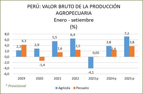 Por otro lado, en los primeros nueve meses del año (enero-setiembre), el sector agropecuario logró un crecimiento de 5,9% en comparación a lo producido en similar periodo del año 2024, sustentado por la mayor producción del subsector agrícola (+7,2%) del subsector pecuario (+3,8%).