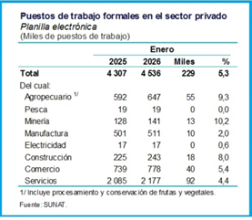 El BCR también informó que, en el primer mes de 2026, el número de puestos de trabajo formales en el sector privado en el rubro agropecuario ascendió a 647 mil (+9.3%), pesca 19 mil (permaneció igual), minería 141 mil (+10.2%), manufactura 511 mil (+2.0%), electricidad 17 mil (+0.6%), construcción 243 mil (+8.0%), comercio 778 mil (+5.4%) y servicios 2.177.000 (+4.4%).